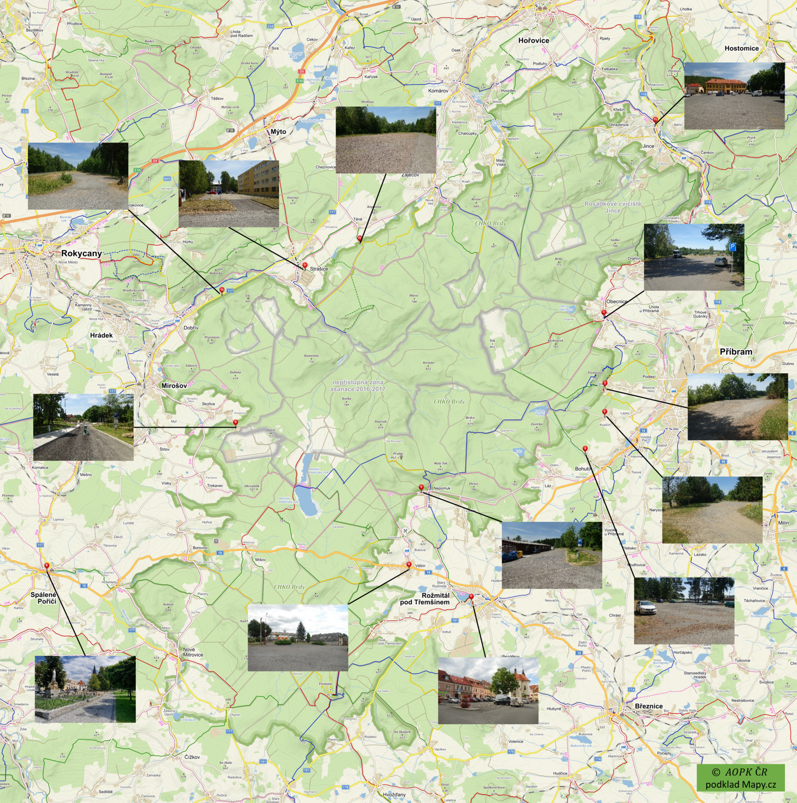 - Na většině území CHKO Brdy platí zákaz vjezdu motorových vozidel. K zaparkování automobilů můžete využít parkoviště v obcích při okraji oblasti.